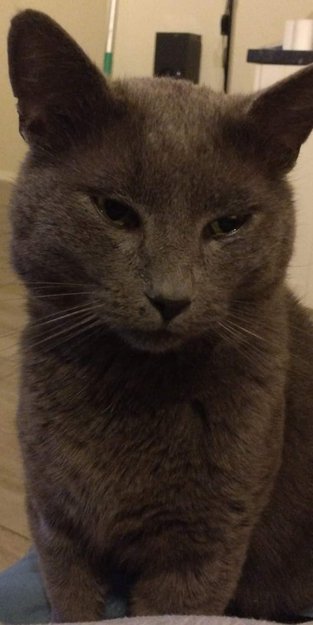mørke grå pus, men litt lysere i området i fjeset.Han har et lite hakk på den ene øret.