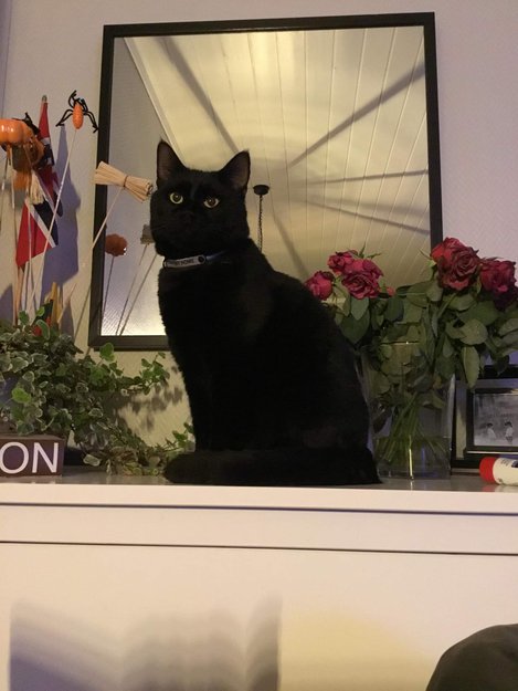 Kuro er svart, men har litt hvit på halsen og brun på halen. Også han har blå halsbånd