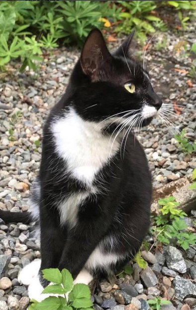 4 år gammel hunn-katt, sterilisert og chippa. Lyder navnet Liss. Hun har sort, tykk og kort pels. Hvite labber, hvit under haka og på magen. Har en hvit ring rundt hele venstre lår.