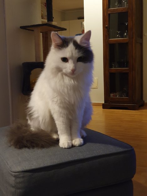 Hvit med grå fyldig hale, på venstre side er det et grått hjerte i pelsen. Ellers er det grå flekker i pelsen.