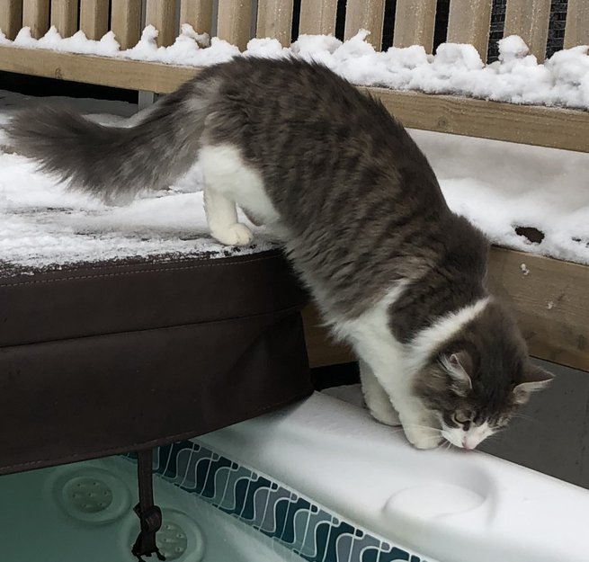 Stripete på «kinnene» og på sidene, helhvit på magen. Hun har vært barbert pga bitt i høyre frambein, så kortere pels der fortsatt.