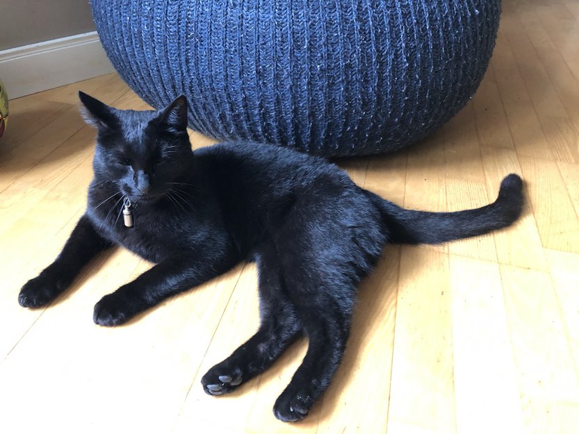 Supersosial, noen få hvite hår på magen. Går inn i andres hus.