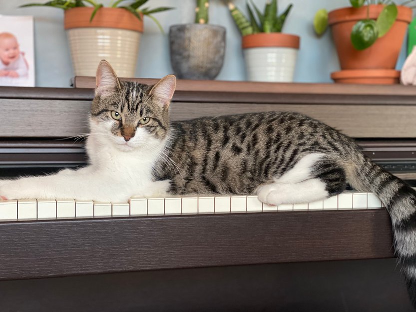 Er lett å kjenne igjen med mørkere pelsflekk på ene siden av nesa. Han er 8 måneder, og har åpenbart ikke 100% stedsans enda...