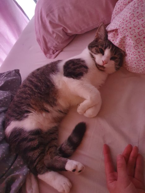 Han är ganska liten, till växten. Rosa nos, och ganska speciella mönster i pälsen. Bland annat en stor rund fläck på höger sida, syns på bilden. Han har bara varit innekatt tidigare, väldigt rädd för nya ljud och människor. Han var adoptert från fod-gården, hade precis börjat lyssna till mig när han försvann. Väldigt duktig på att gömma sig, bland annat tagit sig in i en byrå bakvägen. För att lägga sig i en byrålåda, letar sig gärna till små utrymmen.