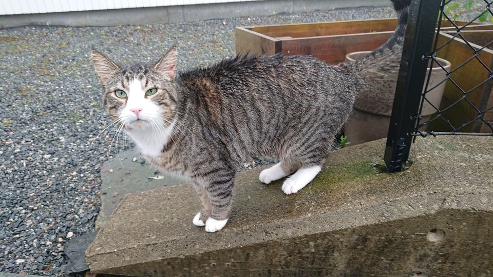 En forholdsvis stor katt på 6 kg. Grå og svarte striper, hvite sokker, hvitt bryst og snute. Lys brun flekk på underleppe.