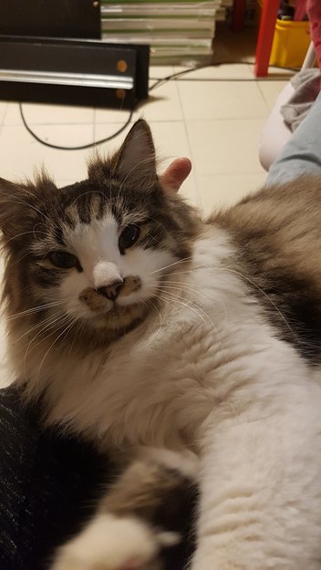 Han har brune flekker rett ved siden av nosen. Han har et blått halsband med tlf nr og bjelle. Veldig kosete og kontaktsøkende. Redd for biler/høye lyder.