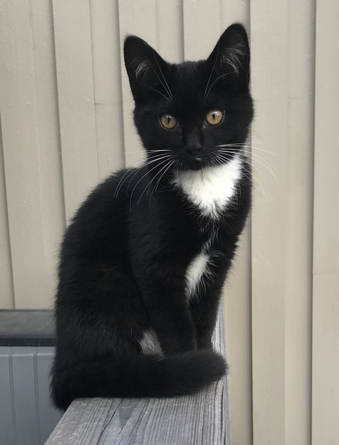 Sort pels med hvitt bryst og poter. En bitteliten hvit flekk like ved munnen. Svært tillitsfull, svarer på navnet sitt. Ekstremt nysgjerrig og uredd, så kan ha blitt stengt inne i en garasje, kjeller, bod e.l.