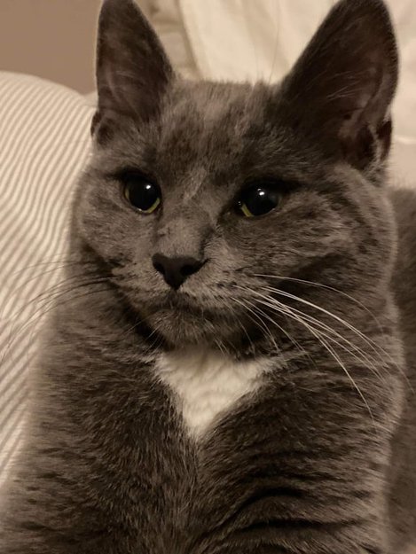 Luna er grå med hvit på halsen og potene. Hun har ingen hale bare en stump. Hun har veldig spesiell pels