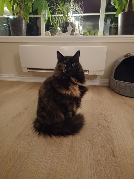 Lå på utestol og sov i skinnfell, sto opp, spiste og gikk. Klokka var da ca 16:00. Dato 18.12.21. Siden det har vi ikke sett henne. Har gått runder på runder og ropt, lyst inn i garasjer, fått naboer til å lukke opp garasjer, lokka med godis.