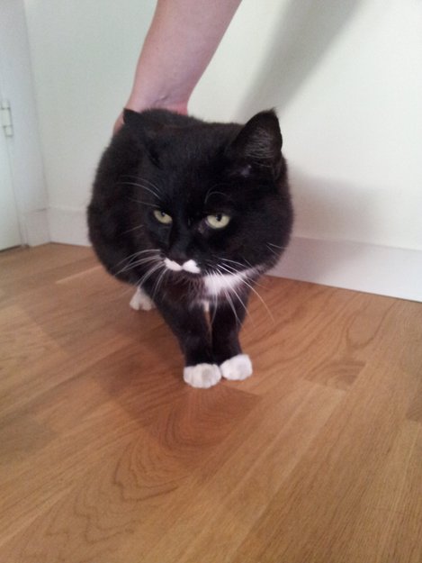 Svart og hvit korthåret. Hvit "sløyfe" over nese, og hvit under haken og på alle potene. Liten hunnkatt.