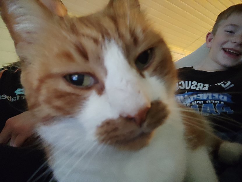 Han er litt sjenert. Og har et rød bart under haka og rund mund. Merke i øre og id chipet.