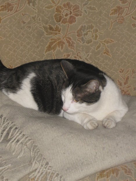 han er en stor katt, med litt spisst ansikt, veldig kosete.
