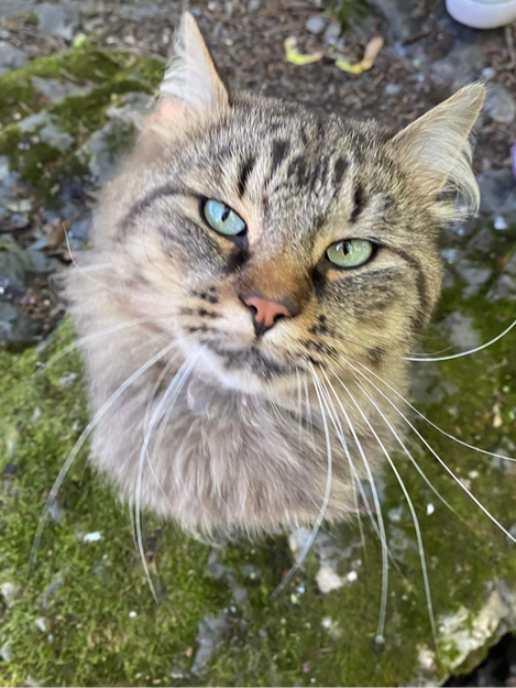 Denne pusen har sporadisk holdt til rundt blokka siden jeg flyttet hit i sommer. Etter hva jeg har forstått etter samtale med flere naboer har hun(?) vandret i området i flere år mens beboere i området har gitt henne litt mat fra tid til annen.