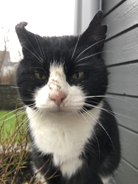 Virker syk og har en del sår i ansiktet, spesielt rundt nese og ører.