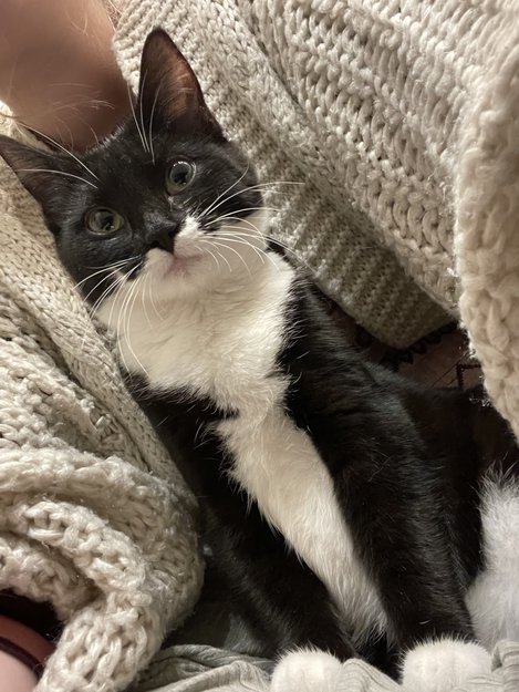 Hun ble kastrert forrige fredag, så hun mangler pels på venstre side bak. Hun har også en hvit bart som går litt opp på munnviken på venstre side. Hun er veldig liten, og veier lite. Hun har ankelsokker fremme og høye sokker bak. Hvit på magen.