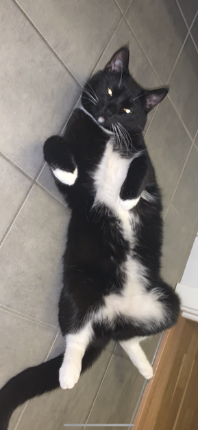 Svart med hvit flekk på hake, hvit mage og poter. Han er ganske stor, med lang hale. Veldig kosete og kontaktsøkende, men kan være ganske skvetten når han er ute fordi han er ikke vandt til det. Er chippet, ingen halsbånd.