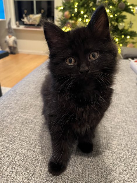 Kattungen er 3,5 mnd. Hun har litt gråt/hvitt i pelsen. Noe tynn pels under venstre øye.