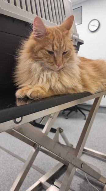 Rødtigret, hvit mave, lang manke, 5.5 kg, ikke halsbånd, "M" mønster i pannen, rolig, kastrert, chippet.