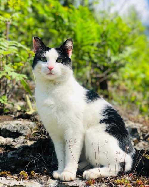 Max er svart og hvit katt. Han har merke på ryggen som et svart hjertet