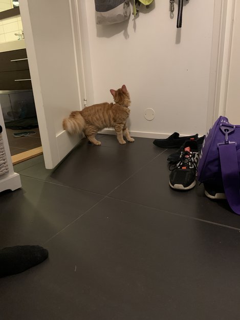 Katt med sele og bånd funnet bak huset vårt på Lilletveit. Satt fast med båndet surret rundt en grein.