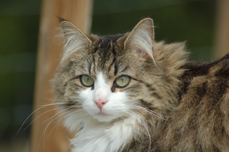 Veldig kosete katt. Hvit i ansiktet og hvite bein. Hadde et lite sår over snuten sist den ble sett.