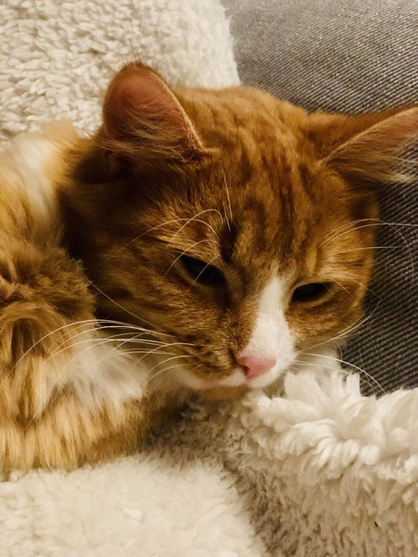 Orange med hvit snute. Hvite områder på bryst og mage, og 4 hvite sokker.