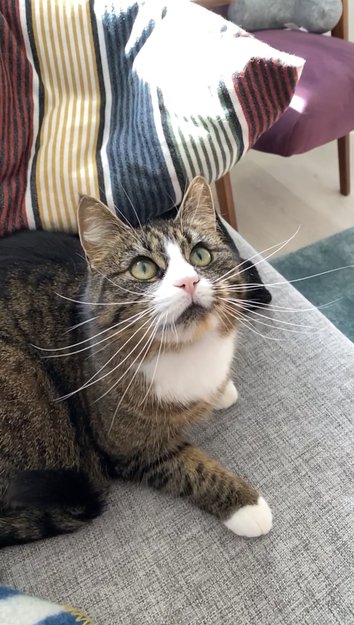 Hun er chippet og sterilisert. Kosete, men syns ikke det er noe særlig å bli holdt. Hun reagerer spesielt godt på lyden av klirring med nøkler.