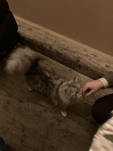 Grå/sort langhåret katt, virker tam og snill, ganske tynn men ser sunn ut. Virker ikke som den har vært lenge ute.