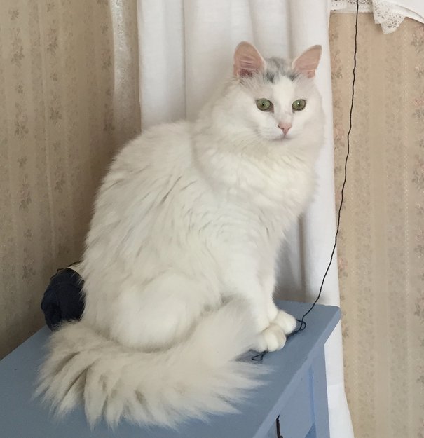 Vegas er en hvit, langhåret hannkatt, er en svak sort/grå markering på hodet.