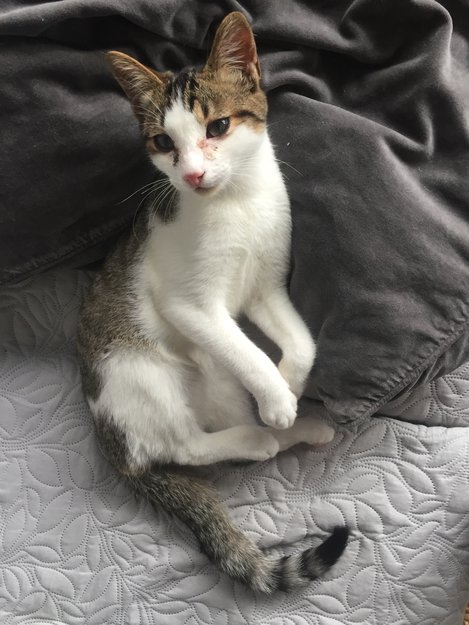 Hele undersiden er hvit, det vil si fra panna (bryst, mage) og helt til området under halen, (inkludert potene). Oversiden fra ørene, ryggen og til og med halen et svart -og brunstripete. Han er 8 måneder gammel.