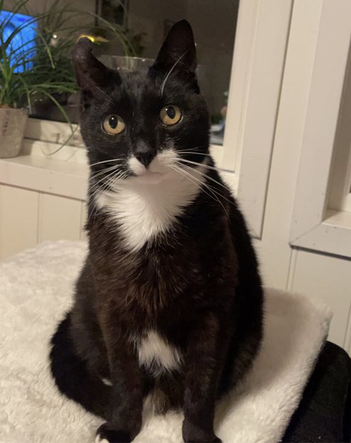 Sort katt med hvitt på bryst, mage og sokker. Har en knekk på høyre øre.