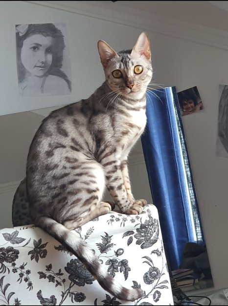 Ho har hvit pels med svarte prikker. Veldig gule øye. Tynn å lang