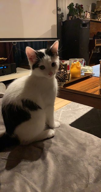 Han er svart oppå hodet og for det meste hvit. Svarte flekker