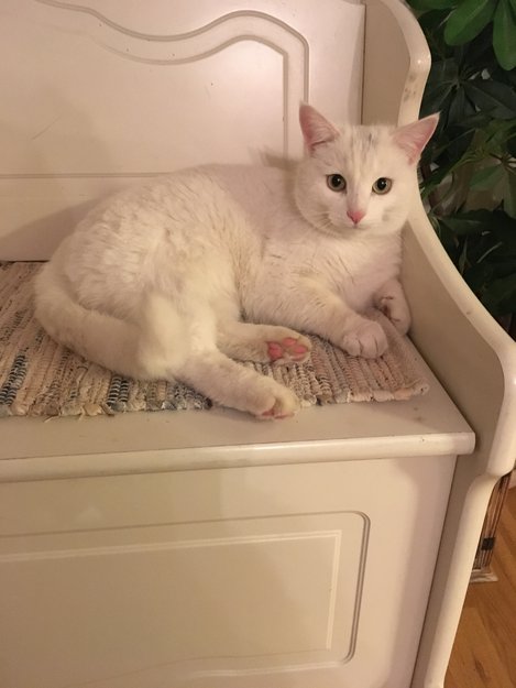 Han er en helt hvit 6 år gml katt, med gulgrønne øyner. Sterk og sunn, sosial og hjemmekjær.