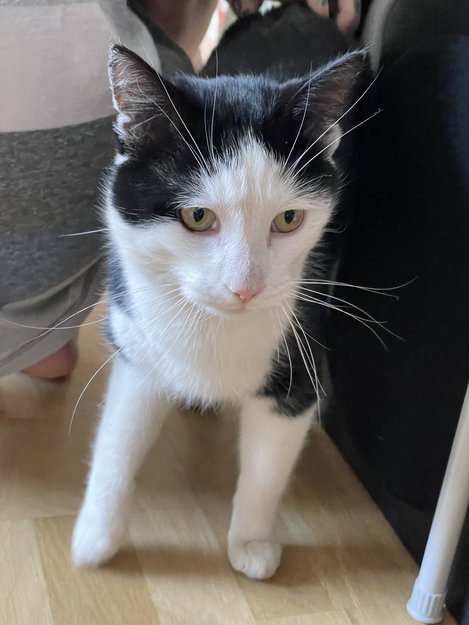 Svart og hvit katt, svart på hale, rygg, toppen av hodet. Hvit i fjeset og på alle bein og poter