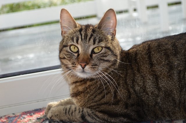 Hakk i høyre øre fra et bitt som er grodd. Tigerstripete (gråbrun med sorte striper). Grønn-gule øyne. Ganske stor.