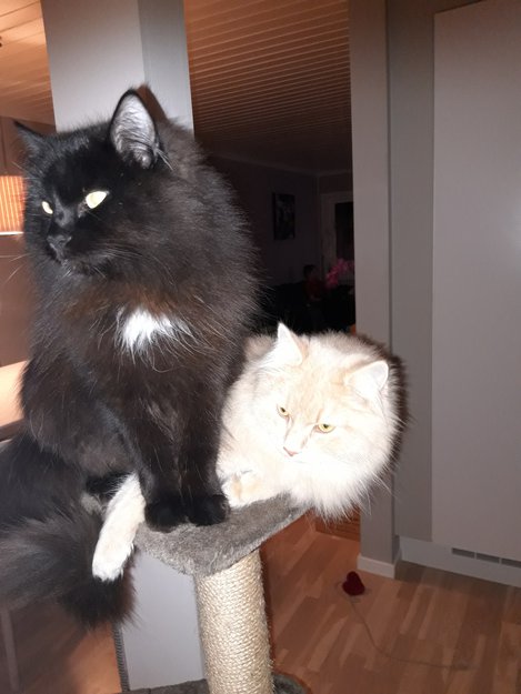 Brun-sort langhåret pels med hvit flekk på brystet. Stor hale.