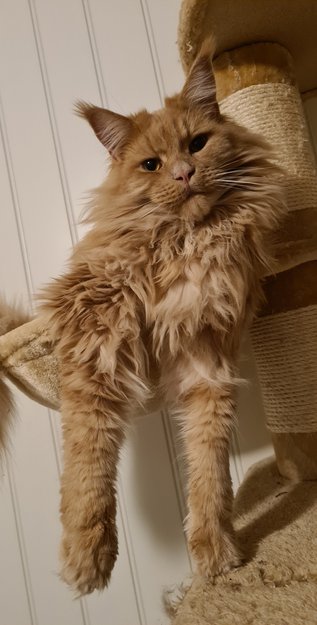 Stor hannkatt med ganske lang pels. Ensfarga beige i fargen. Nylig barbert på begge hoftene.