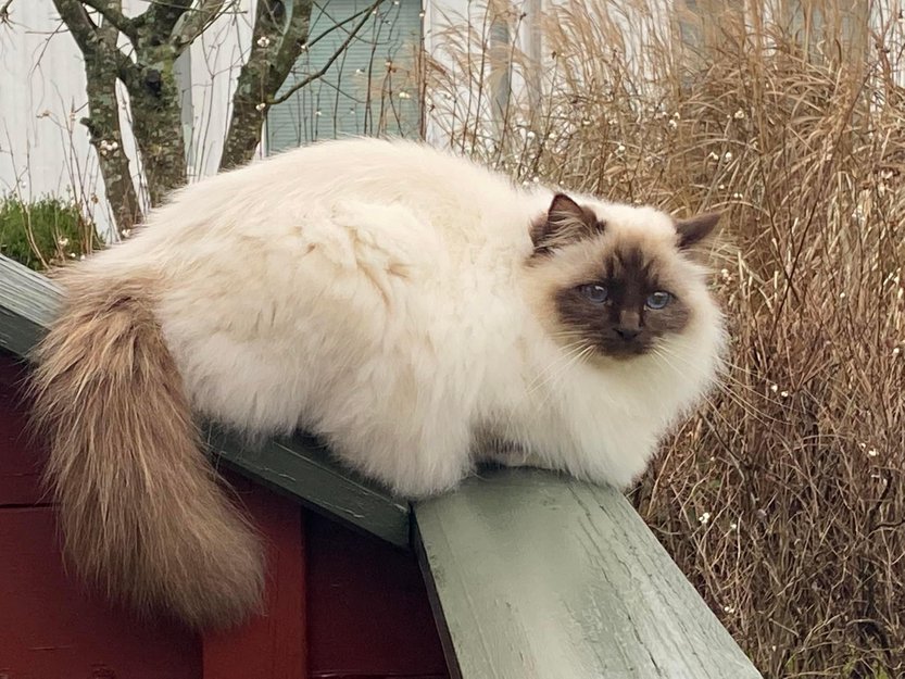 Hvit katt med brun hale og brun maske (hode), blå øyner..