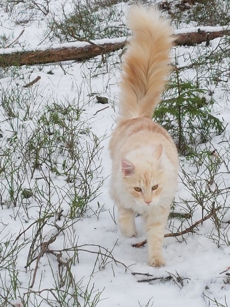 Han er langhåret med en skikkelig bustehale. Lyder navnet Nemo. Liker å løpe etter snøball,eller annen ball🙂