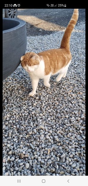 Prøvd å komme seg inn, veldig kontaksøkende, og veldig sulten. Ingen som eier den i området. Etterlyst eier på lokale grupper. Ikke chippet eller kastrert. Pus blir ivaretatt av FOD. Fått navnet Happy