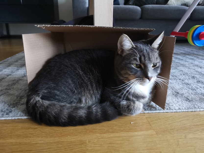 Milo er en hannkatt på 1 år. Han har gråstripete kort og glatt pels og hvite poter.