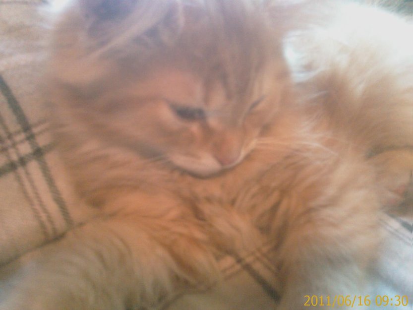 Han er 1 1/2 år, han er rød med hvite poter. Hvit under haken, lang håret med lang bustete hale. Han er litt sky for folk ute.