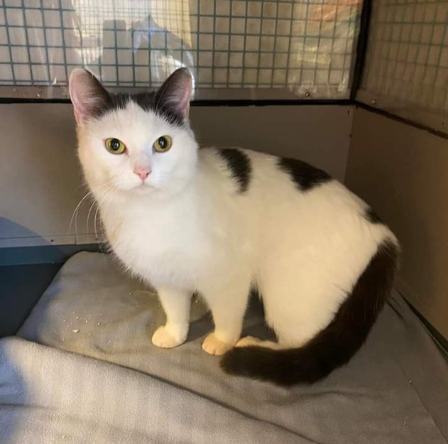 Hunnkatt, ikke id-merket. Svart hale, svart øverst på hodet, to svarte flekker på ryggen, helt hvit under.