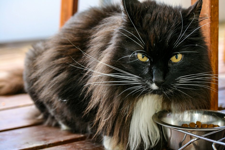 Stor katt. Stort sett svart i pelsen men med hvite områder, blant annet på halsen og på potene. Trolig ikke så sosial mot fremmede. Han er en eldre katt, men har ikke helseplager grunnet alder.