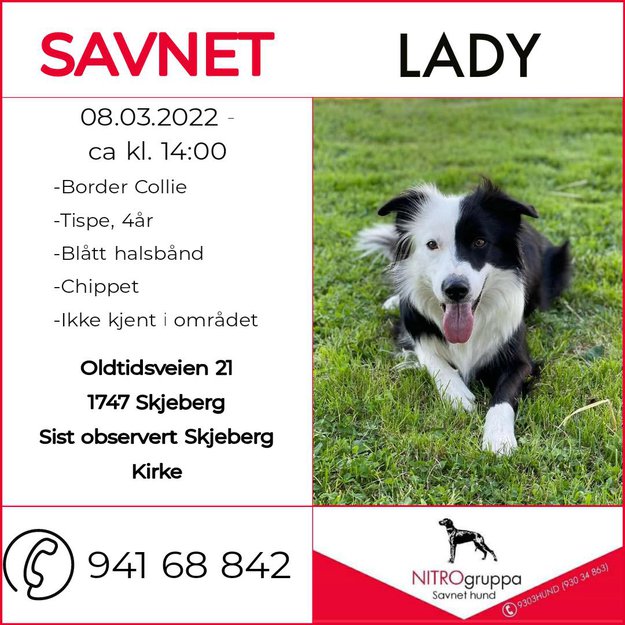 Se bilde. Sort og hvit border collie. Lett gjenkjennelig pga todelt farge i ansiktet.