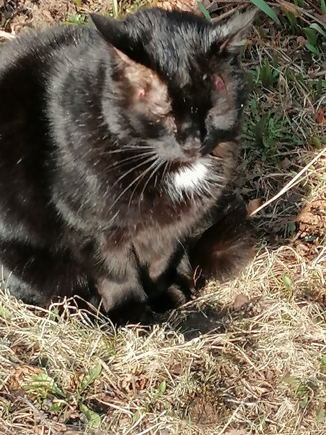 Denne katten har gått her siden 2019,den har vært veldig kosen og flott, men har nå den siste tiden blitt medtatt, sår i ansiktet, halsen og pelsen er tykk. Den er mellom 5 og 8 år tipper jeg, med hvit flekk på brystet.