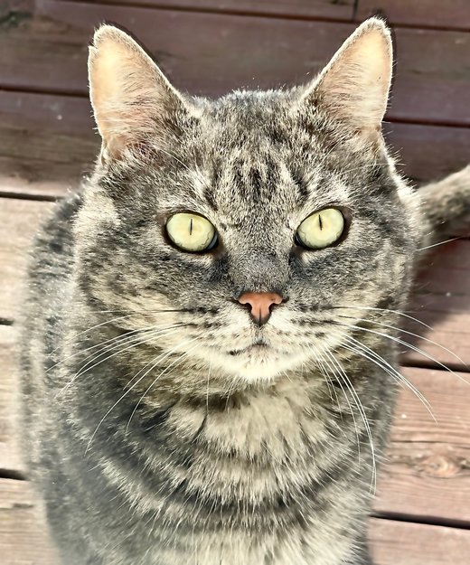 Denne katten oppholder seg svært mye hos oss, den står på verandaen og stirrer inn. Når jeg går ut stikker den, men den holder seg i nærheten så den virker ikke til å være helt vill.