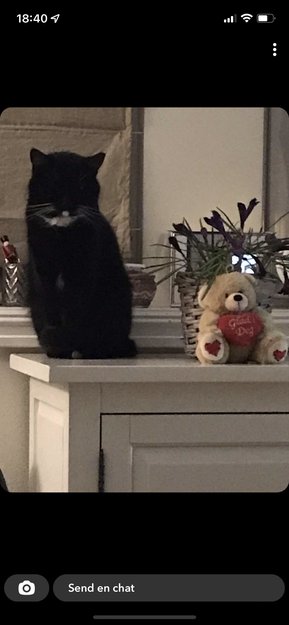 Hun har hvite poter. Er veldig kosete. Hun har en gull krone med bjelle på seg.
