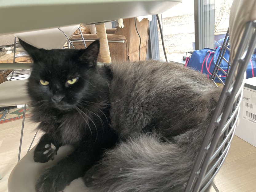 Kaos er en kastrert hannkatt, 6 år, stor (blanding Maine Coon og norsk skogskatt), nesten helt svart, har en knekk ytterst på halen (synes ikke, men kjennes når du tar på han). Han liker mennesker.